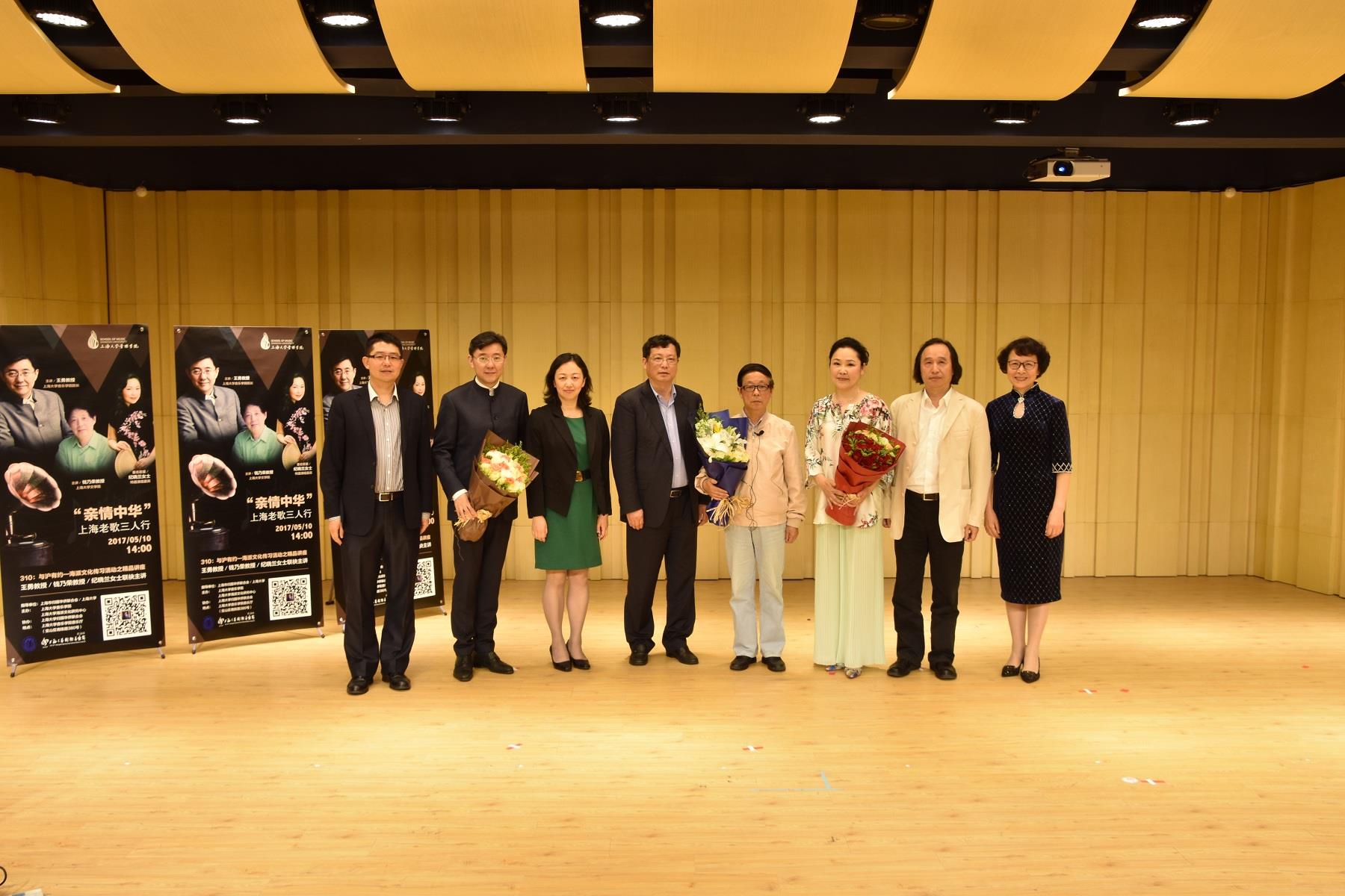 讲座伊始,由吴悦教授介绍到场嘉宾,随后请出音乐学院院长王勇教授正式开讲。王勇院长先从近年来对上海老歌的研究历程进行了梳理与回顾,使我们更加清晰的了解到上海老歌在历史变迁中的发展脉络;接下来,王勇向大家讲述了中国流行歌曲的诞生,中国流行歌曲诞生在1927年的上海,其代表作为黎锦晖创作的《毛毛雨》等爱情歌曲,黎锦晖不仅是作为中国儿童歌曲作曲家而出名,更是中国流行音乐、爵士音乐的奠基人,但在当时的年代,他的作品却被鲁迅先生批评为“靡靡之音”、“黄色歌曲”,讲座中王勇对其创作的歌曲进行了新时代新视角下的新思考,重温《毛毛雨》、《香格里拉》两首经典老歌,引起了听众对老歌中所传达的情感的新的解读和思考;随后,王勇邀请著名歌唱家纪晓兰女士献上用普通话与沪语演唱的《玫瑰玫瑰我爱你》、《三轮车上的小姐》,让观众聆听到纯粹原味的上海老歌,体味沪语老歌的独特韵味,不少观众还随旋律一起哼唱,现场气氛十分热烈。