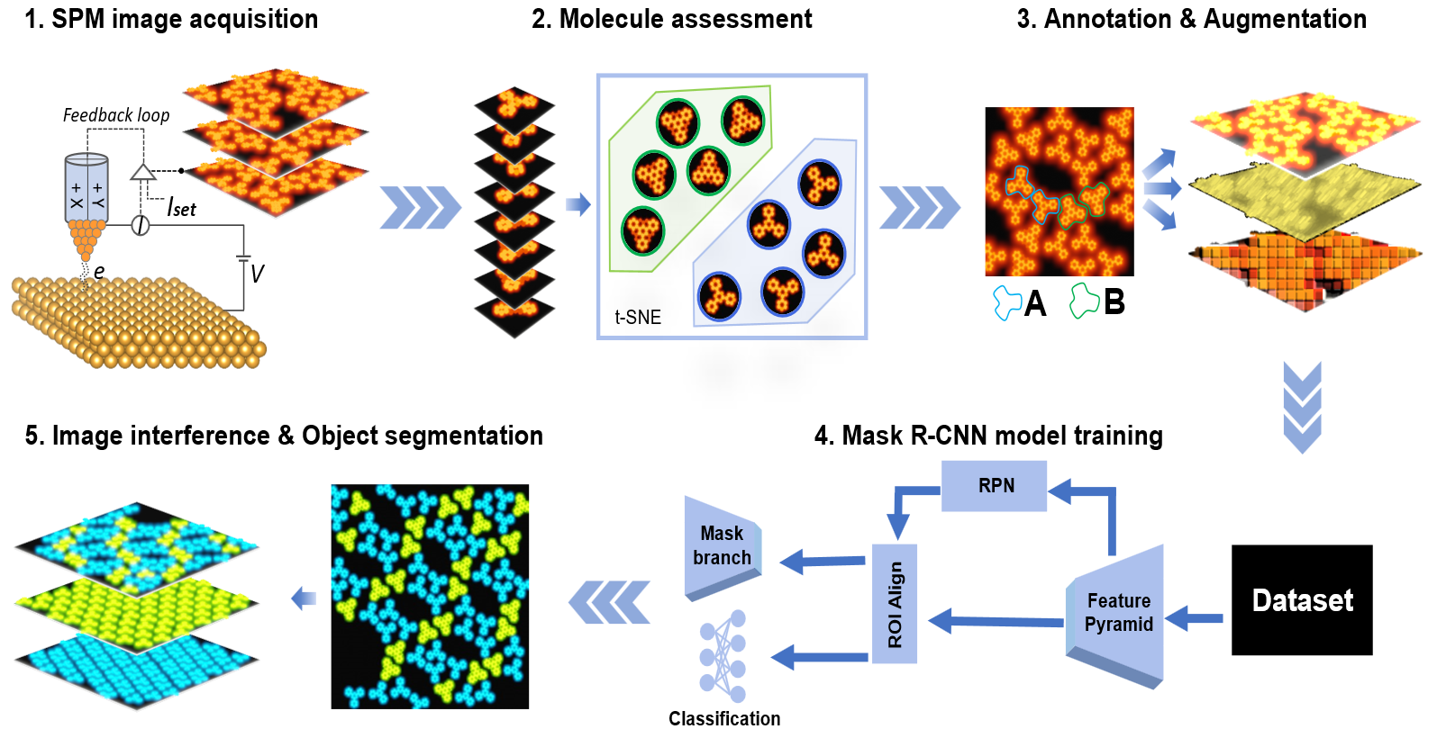 图1:深度学习框架工作流程概述。此工作流程从标准SPM图像采集开始,然后通过t-SNE算法进行图像评估,该算法用于确认高分辨率SPM图像中分子的可分性。随后,在原始SPM图像中选择一个小区域的分子进行标记和数据增强,并作为实例分割深度学习模型(Mask R-CNN)的数据集。最后,机器视觉模型在训练后将自动批量评估SPM图像并输出预测结果。
