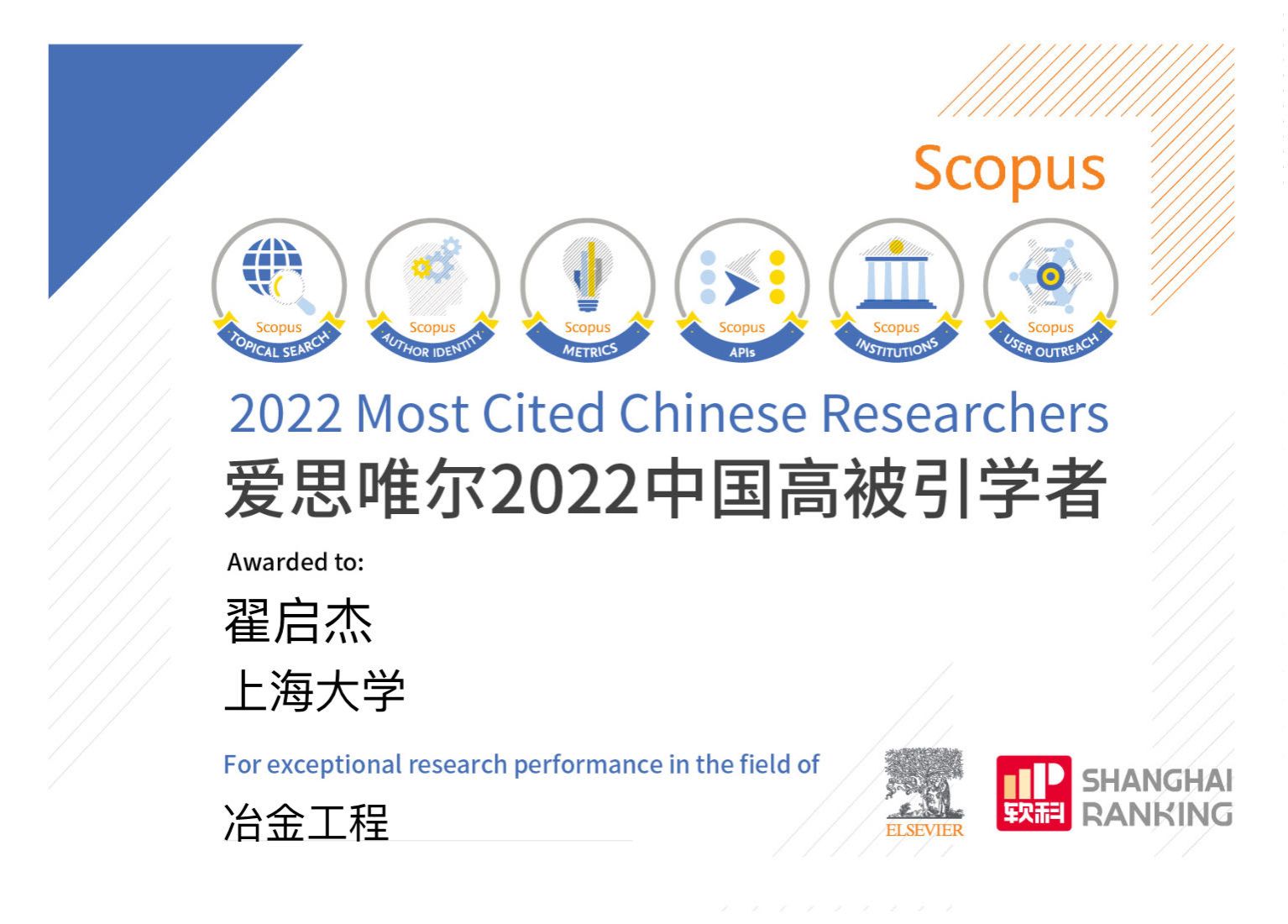 3月28日,爱思唯尔(Elsevier)发布了2022“中国高被引学者(Highly Cited Chinese Researchers)”榜单。我校先进凝固技术中心(简称CAST)主任翟启杰教授继2020年、2021年后,连续第三年入选“冶金工程”专业高被引学者。这是国内外同行对翟启杰教授带领的CAST团队原创性、前瞻性研究工作的高度肯定。
