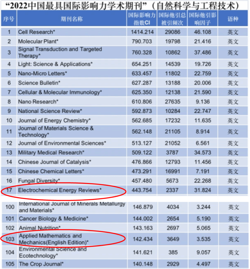 在入选“中国最具国际影响力学术期刊(自然科学与工程技术)”的175种科技类学术期刊中,Electrochemical Energy Reviews(《电化学能源评论(英文)》)排名第17位,Applied Mathematics and Mechanics(English Edition)(《应用数学和力学(英文版)》)排名第103位。《社会》在入选“中国最具国际影响力学术期刊(人文社会科学)”的80种人文社会科学类期刊中位列第59位。