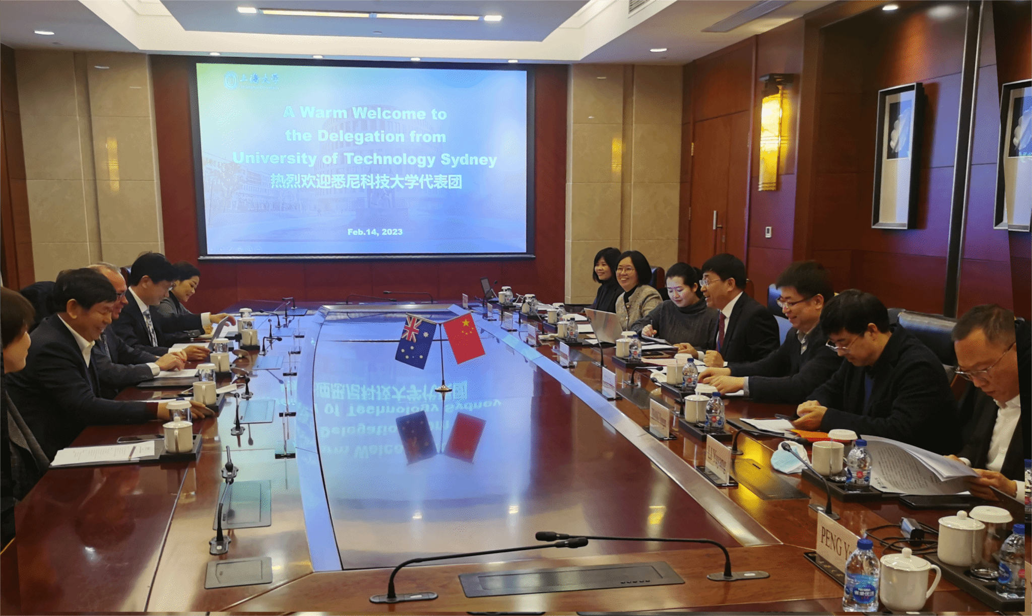 2月14日上午,悉尼科技大学副校长(国际合作)Iain Watt 先生、助理校长(全球伙伴)Leo Mian Liu先生、助理校长(企业合作)Chengqi Zhang教授等一行5人访问我校。校党委副书记欧阳华在乐乎新楼接待了代表团。国际合作处处长崔巍、副处长徐晓红,研究生院常务副院长张勇安,科技园区总经理李宇阳,悉尼工商学院院长吕康娟以及数字化转型研究院中方主任彭艳参加了接待。