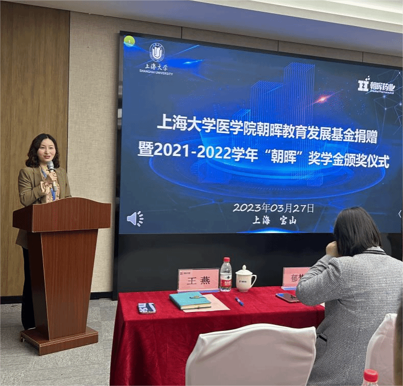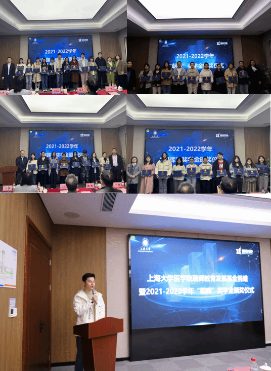 罗店镇领导、朝晖药业领导及姚萱副院长、张川教授共同为获奖学生颁奖。医学院2022级硕士研究生陈苏蒙作为获奖学生代表,分享了他的获奖感言,表达了对朝晖药业和医学院的衷心感谢,表示将心怀感恩、担当奋进,在今后的学习和科研生活中继续坚守初心、自立自强。