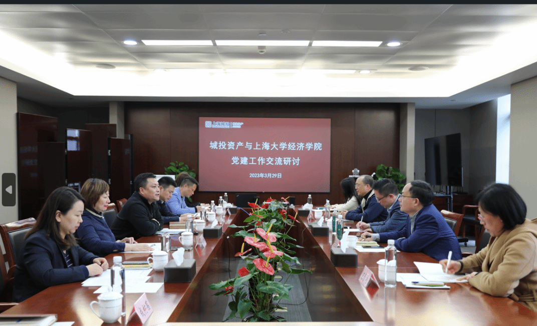 3月29日下午,经济学院党委书记孟添带队至上海城投资产管理(集团)有限公司开展党建共建工作的交流研讨。上海城投资产集团党委书记、董事长沈坚,党委副书记严育新,党委委员、工会主席祁忆群,董事会秘书、党委办公室(宣传部)主任(部长)兼董事会办公室主任侯双,党委组织部(人力资源部)部长杨慧慧,团委书记朱晨昀;经济学院党委副书记、副院长冯玉鑫,上海市软科学研究基地-上海科技金融研究所研究总监祝波,组织员范春艳、团委书记黄婉璐参加会议。