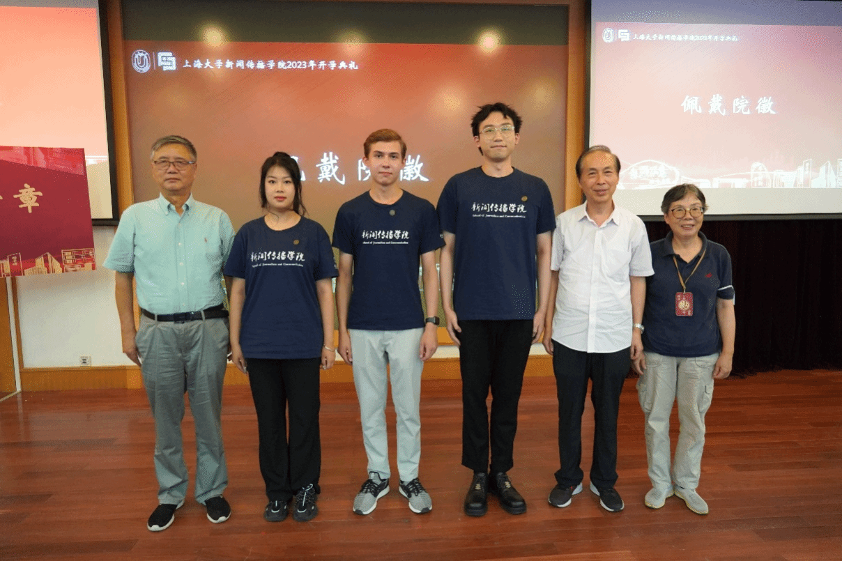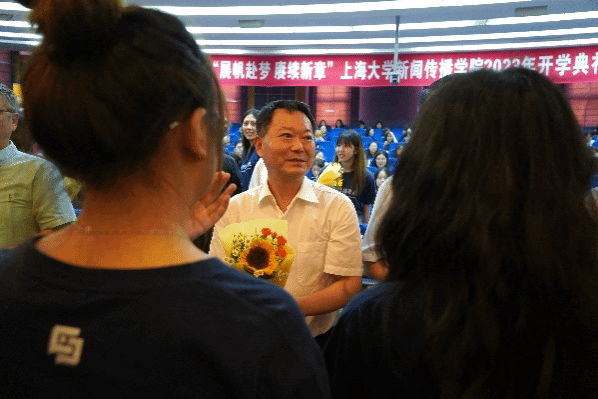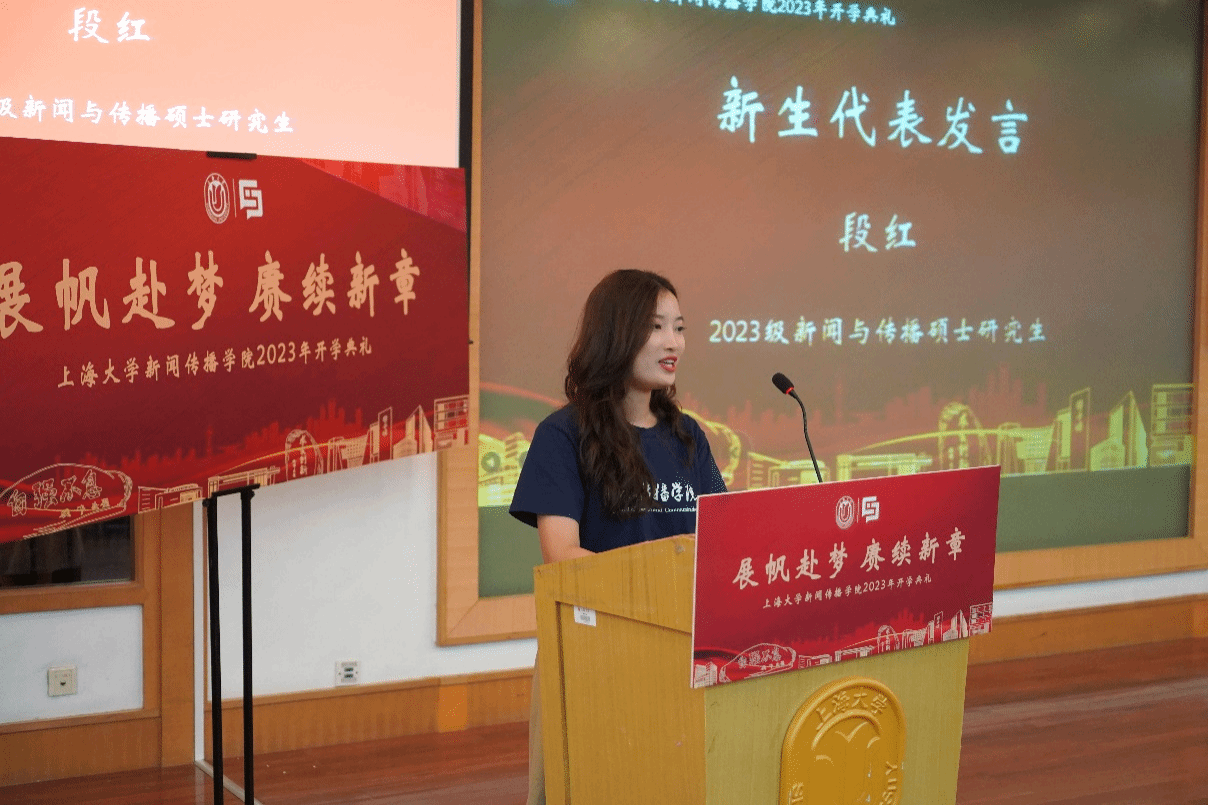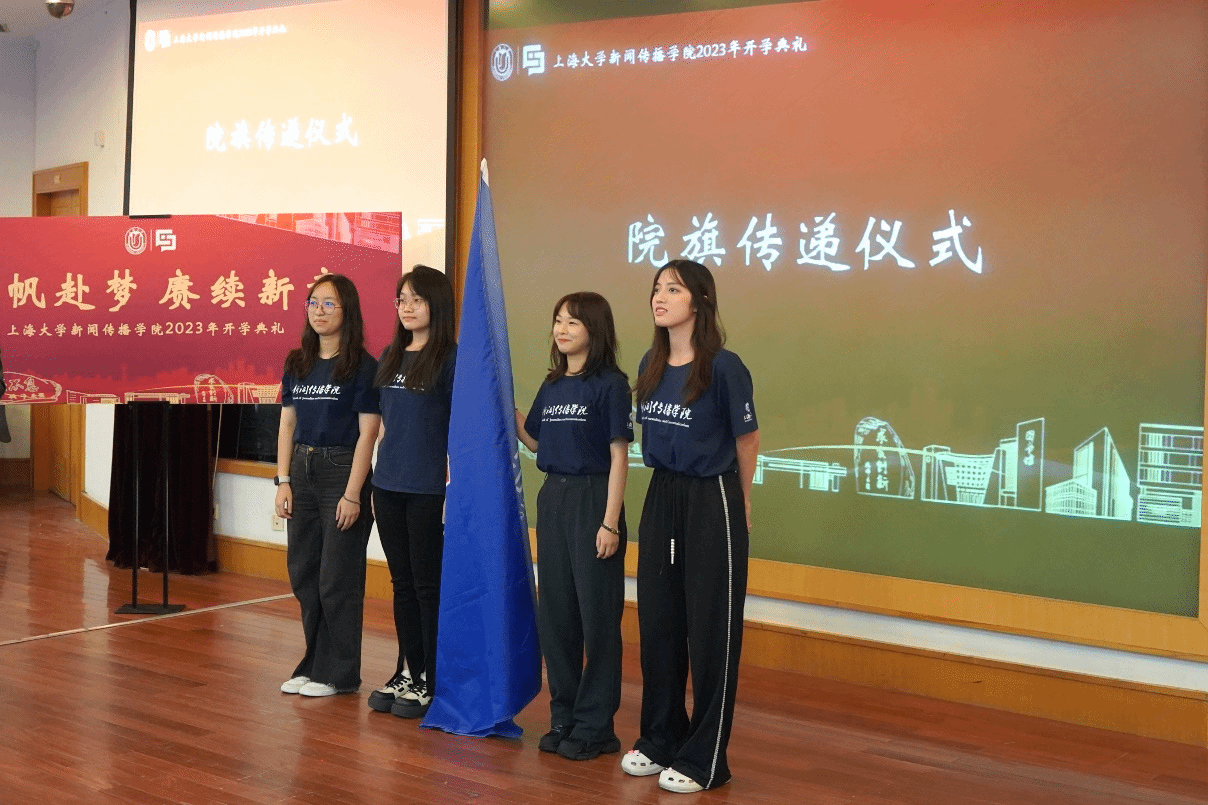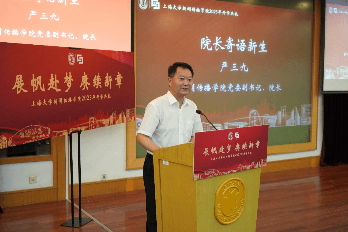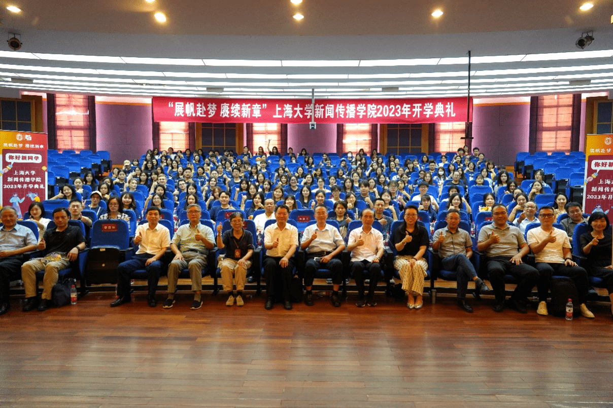 出席此次开学典礼的有新闻传播学院党委书记王晴川,学院党委副书记、院长严三九,学院党委副书记、副院长王智君,副院长赵为学,副院长牛盼强,上海研究院世界传媒研究中心执行主任吴信训教授,新闻传播系张咏华教授,广告学系查灿长教授,智能传播系负责人王虎,智能视听系支部书记刘峰,智能视听系负责人虞国芳,以及专业教师代表、班主任、辅导员、行政老师等,一起见证了新生入学这一重要时刻。本次开学典礼由2023级新闻与传播硕士研究生于昊岑与2022级广播电视学本科生肖芸主持。