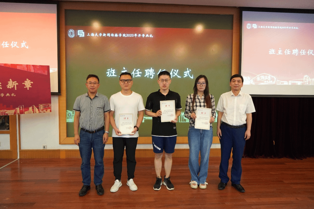 班主任是学生的人生导师和知心朋友。今年,共有五位老师担任2022级大类分流本科生班主任,他们分别是新闻学班班主任陶文静老师、广告学班班主任刘志杰老师、会展班班主任何会文老师、广播电视学班班主任刘峰老师和网络与新媒体班班主任徐偲骕老师。典礼上,新闻传播学院副院长赵为学老师和牛盼强老师为班主任代表颁发聘书,希望他们在学业和生活中帮助同学们成长,陪伴大家度过美好的大学时光。