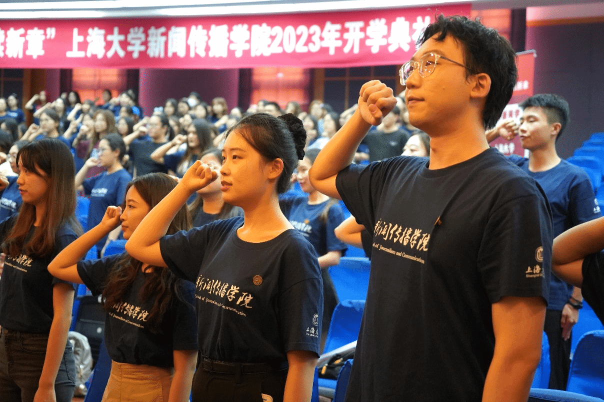 兰勇同学既是一名硕士新生,也是一位退伍军人。在他的带领下,会场内的同学们举起右手,庄严宣读新闻传播学院学生入学誓词。一代人有一代人的使命和征途,全体新生用铿锵誓言传递了新传学子立志求学的决心和信心,也表现了新传学子勇挑时代重担,不惧艰险,在浪潮中开创未来的气概与雄心。