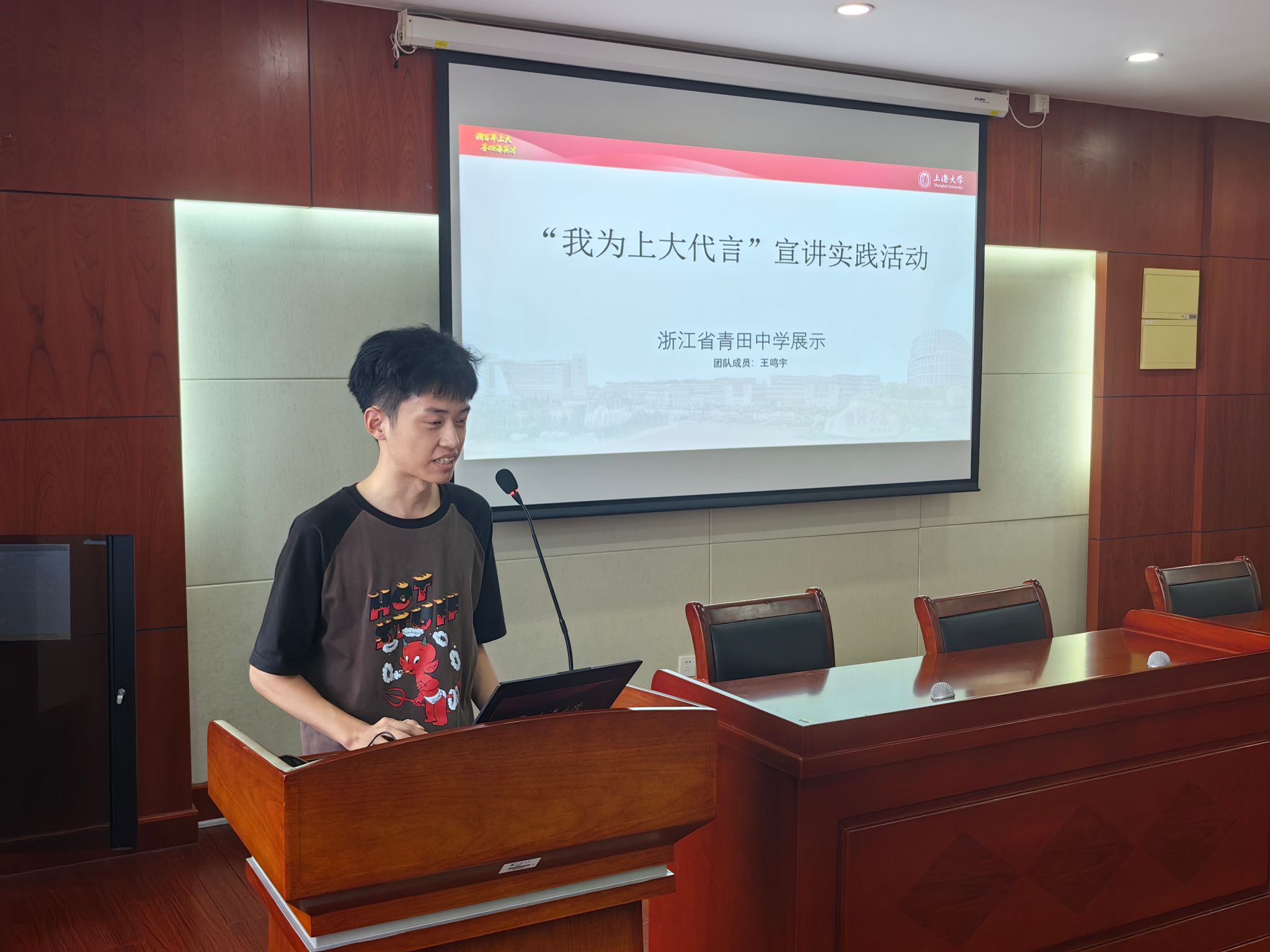 上一年度“我为上大代言”活动大队长袁澍楠同学详细介绍了往期活动的开展情况及活动内容,并鼓励同学们积极参与到活动中。活动优秀团队获得者、来自青田中学的王鸣宇同学结合参与“我为上大代言”宣讲实践活动的经历,针对活动准备、策划、落实及思考等环节作了全面详细的介绍,使同学们对此活动的实践过程有了更加详细的了解。