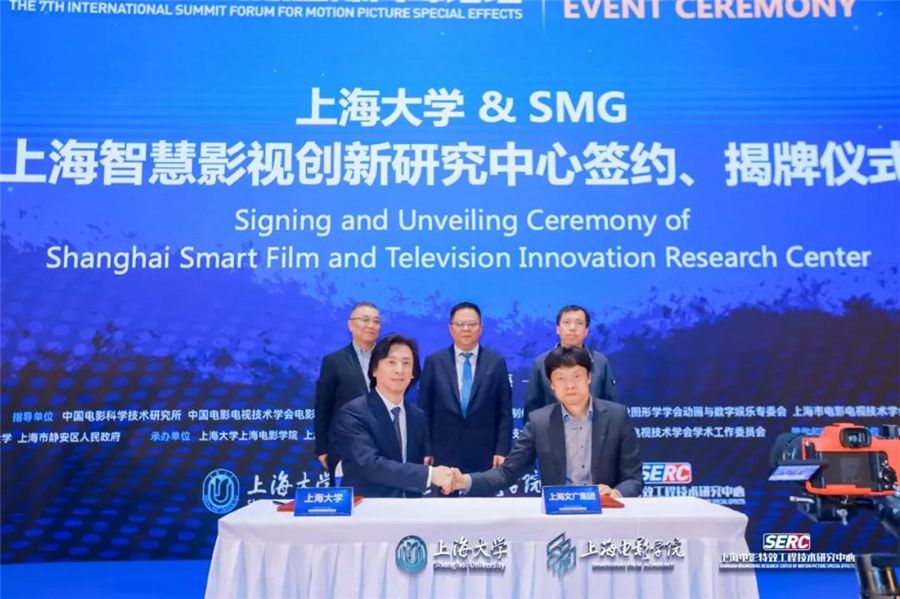 随后,在王从春副校长、陈雨人理事长、刘达总工程师、何小青院长的共同见证下,学院与SMG、蓝海创意云、超梦视影、数字栩生、拜科生物签署了产学研合作协议,并举行联合实验室揭牌仪式。