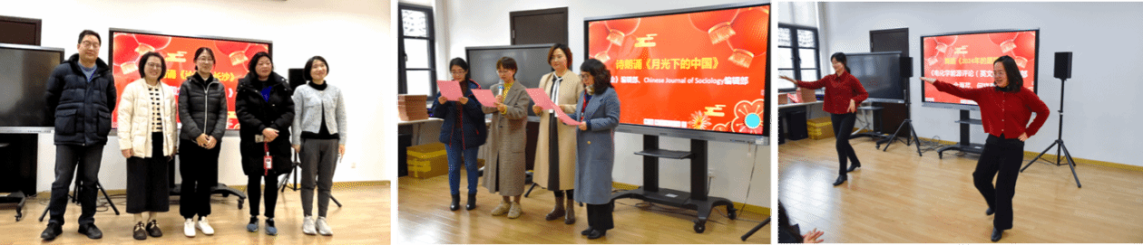 在表彰环节的间隙,会议穿插了文艺节目表演。《应用数学和力学(英文)》、《社会》和《社会》英文刊CJS、《电化学能源评论(英文)》编辑部的老师们带来精彩的节目,包括诗朗诵《沁园春·长沙》《月光下的中国》以及舞蹈《2024年的愿望》等,为大家送上新年的美好祝福。会场内洋溢着欢乐喜庆的气氛。