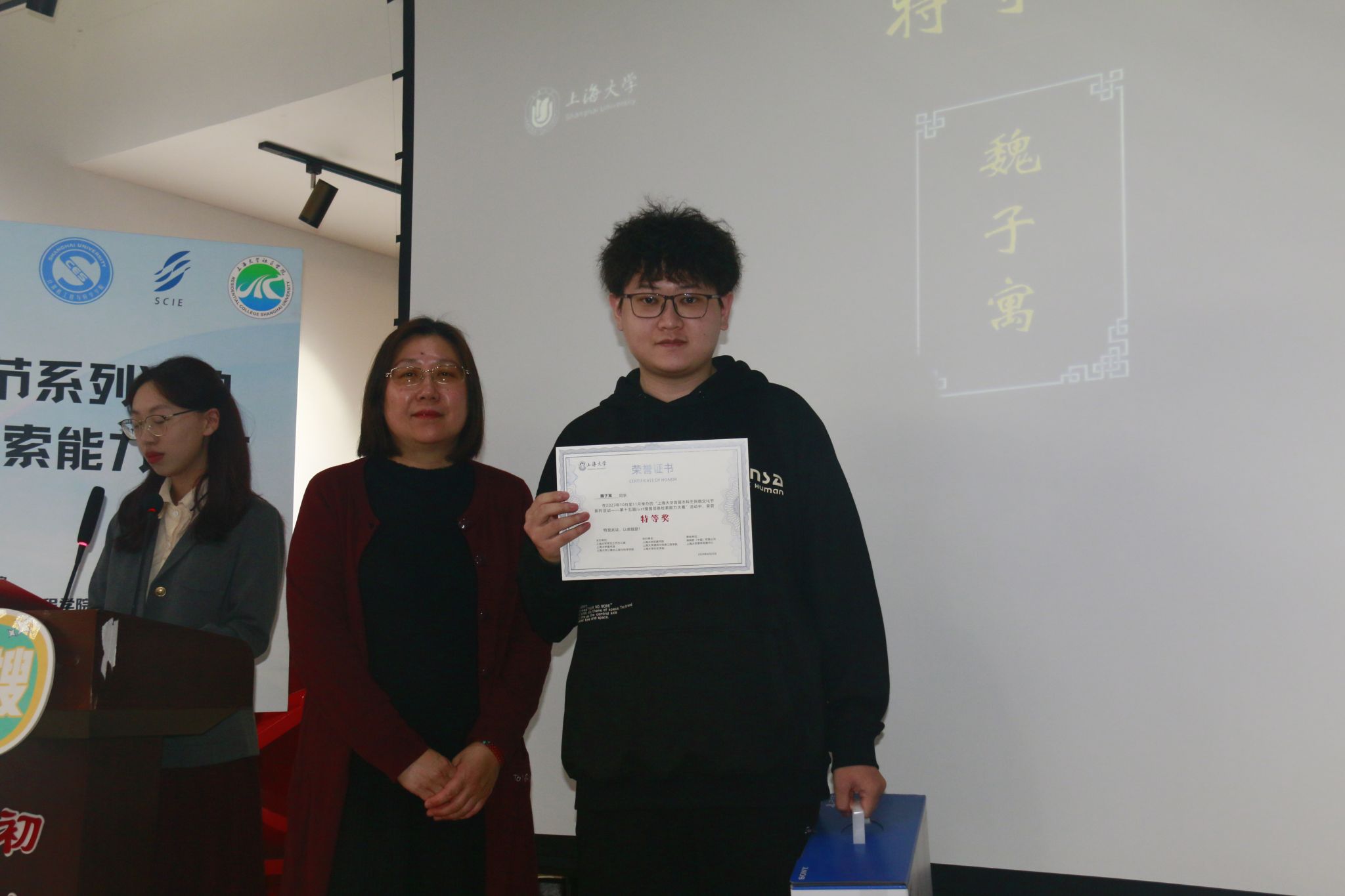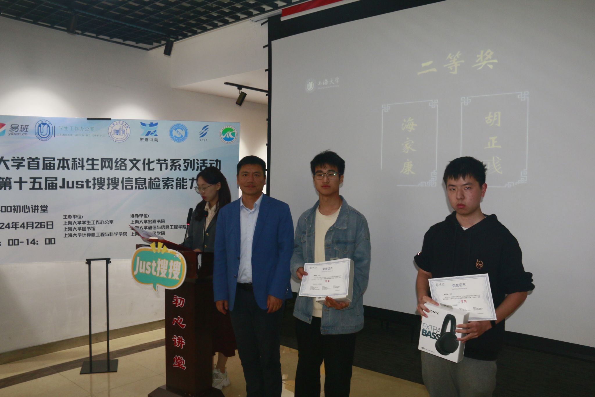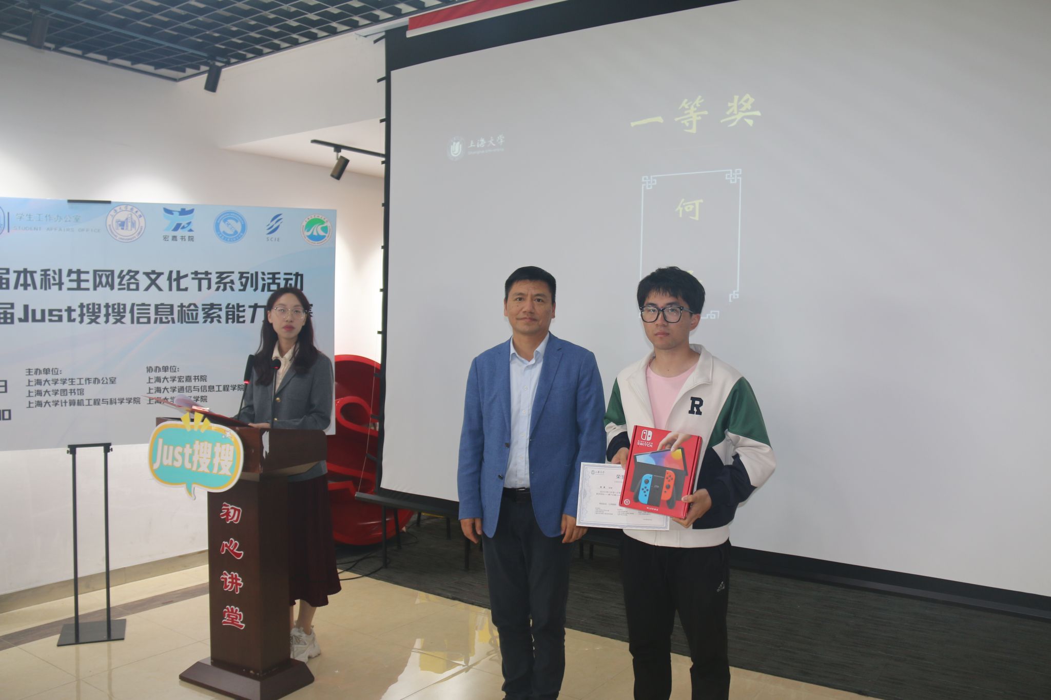 大赛特等奖获得者、来自钱伟长学院21级的本科生魏子寓同学发表获奖感言。他对大赛各组织单位表示感谢,分享了他连续三届参赛的独特经历——大一入学不久,在公众号上了解到形式新颖的“Just搜搜”,对1V1、团队赛、淘汰赛等的赛制安排印象深刻。经过实战历练,他逐渐总结了灵活运用各种搜索引擎和数据库的经验,比如:查找学术论文时,有知网、web of science等专业网站;精确搜索时,避免口语化、抽象化,多使用书面、具象的检索关键词,还有加减号、filetype、intitle等命令辅助查找;关于学校、公司的题目可以找官网,关于游戏、影视有相应的论坛,而遇到贴近生活的问题时,有时小红书、抖音也是一种资源的选择。作为忠实参赛选手,他也为大赛提出了诸多建议和期待。