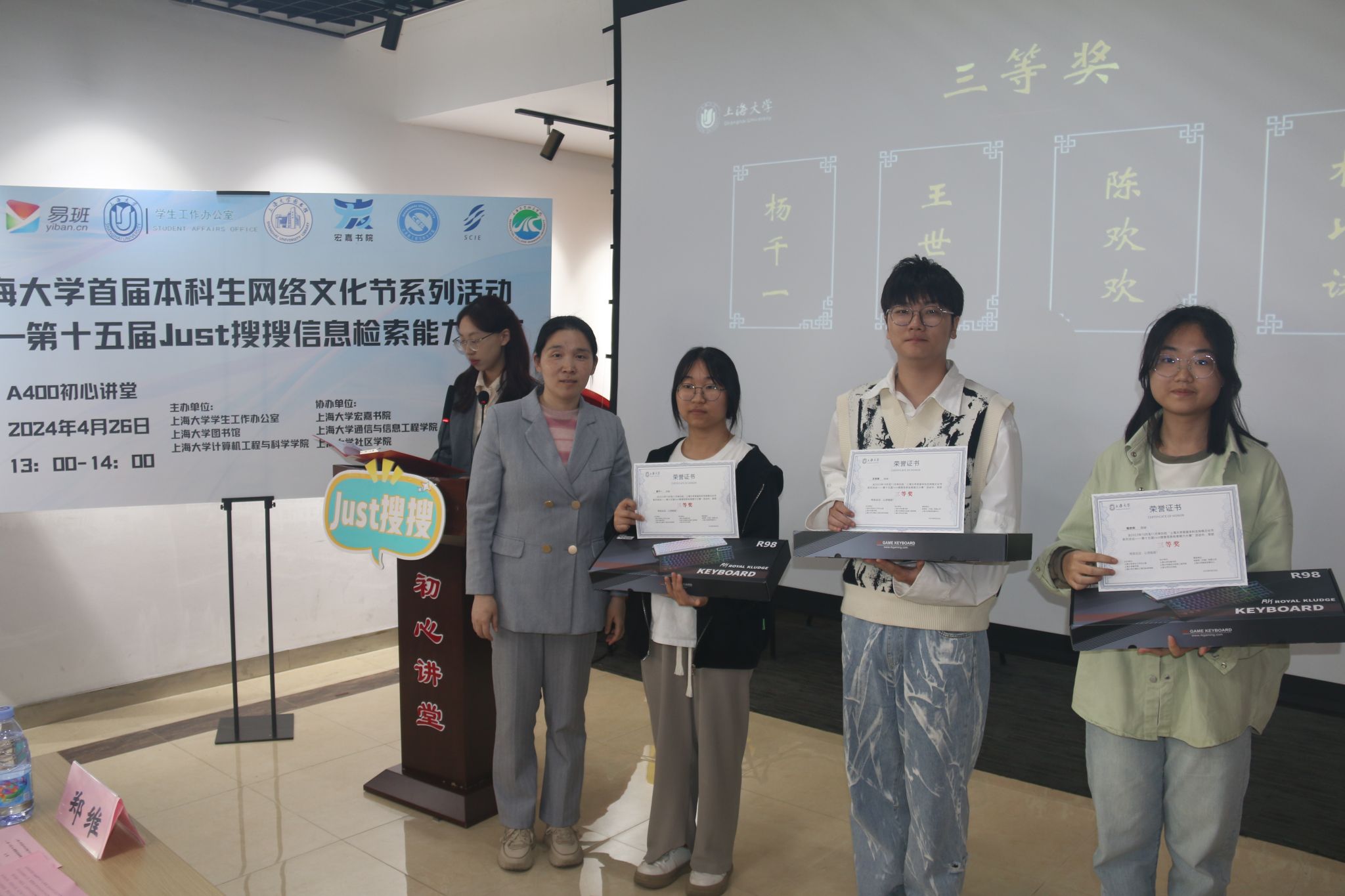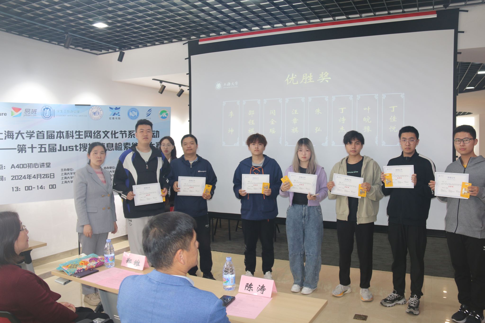 本次大赛有数百人次参与,在激烈的角逐后,最终有16位选手凭借出色的信息检索能力在众多选手中脱颖而出,赢得奖品。郑维、陈涛、赖练等依次为获奖选手颁奖。