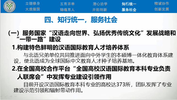 北语的教师团队始终聚焦国家重大发展战略,夯实学科基础;同时也不忘服务国家“一带一路”建设、服务北京“四个中心”战略定位,发挥特色智库作用,为首都来华国际学生教育、文化传承与国际传播等提供人才保障和政策依据。