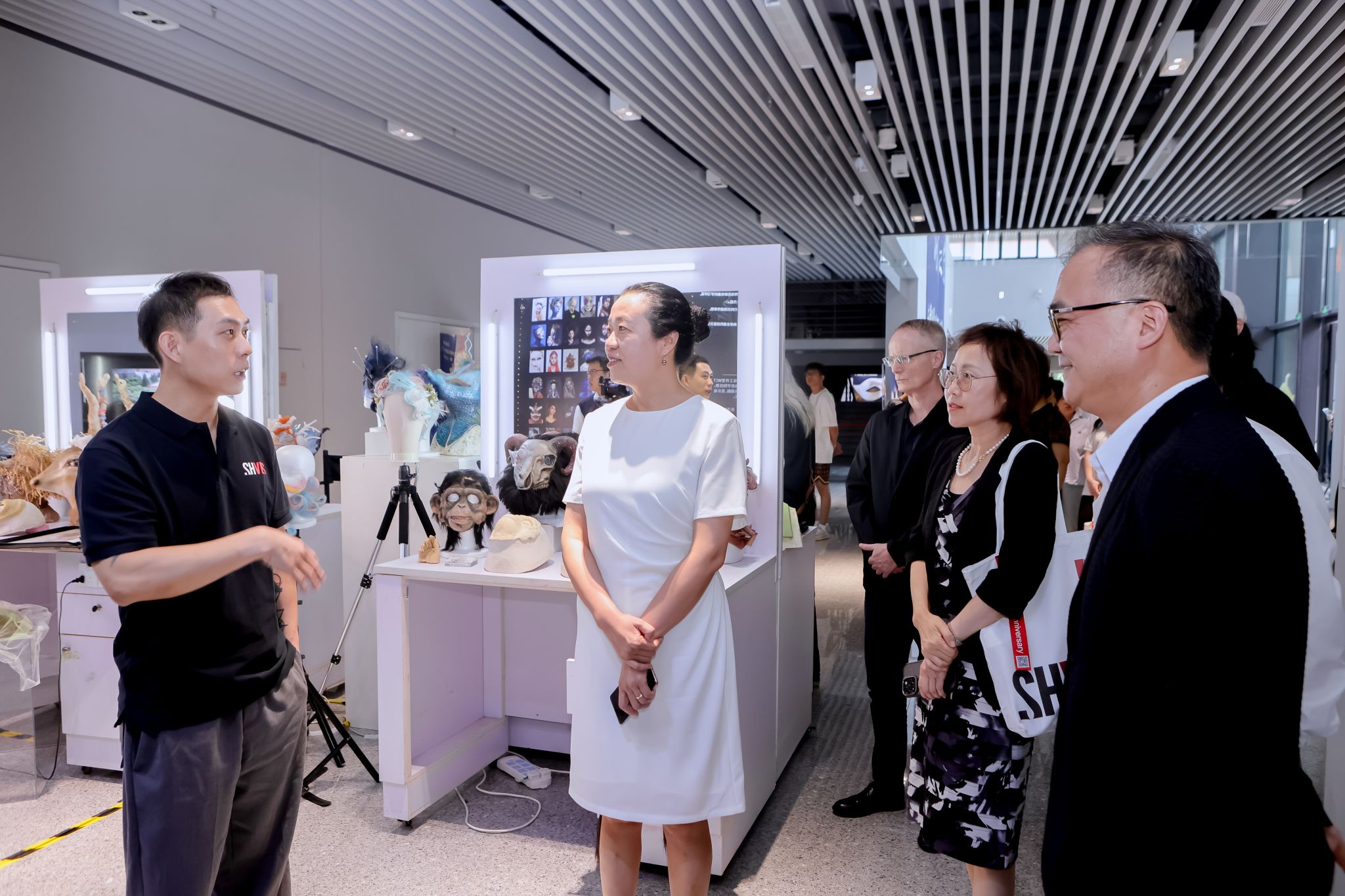 开幕式的尾声,参会领导、嘉宾一同参观了学院各大专业展区。各专业通过短片放映、表演剧场、数字交互、杜比全景声音频体验、特效造型还原、模型制作展示等形式,通过影像艺术、沉浸式戏剧演绎、数字媒体技术等方式极大地丰富了展演现场感官体验,展现出温影师生过往十年在影像艺术领域的独特见解和创造力。参观现场,大家纷纷驻足观看,共同感受师生的创作风貌。