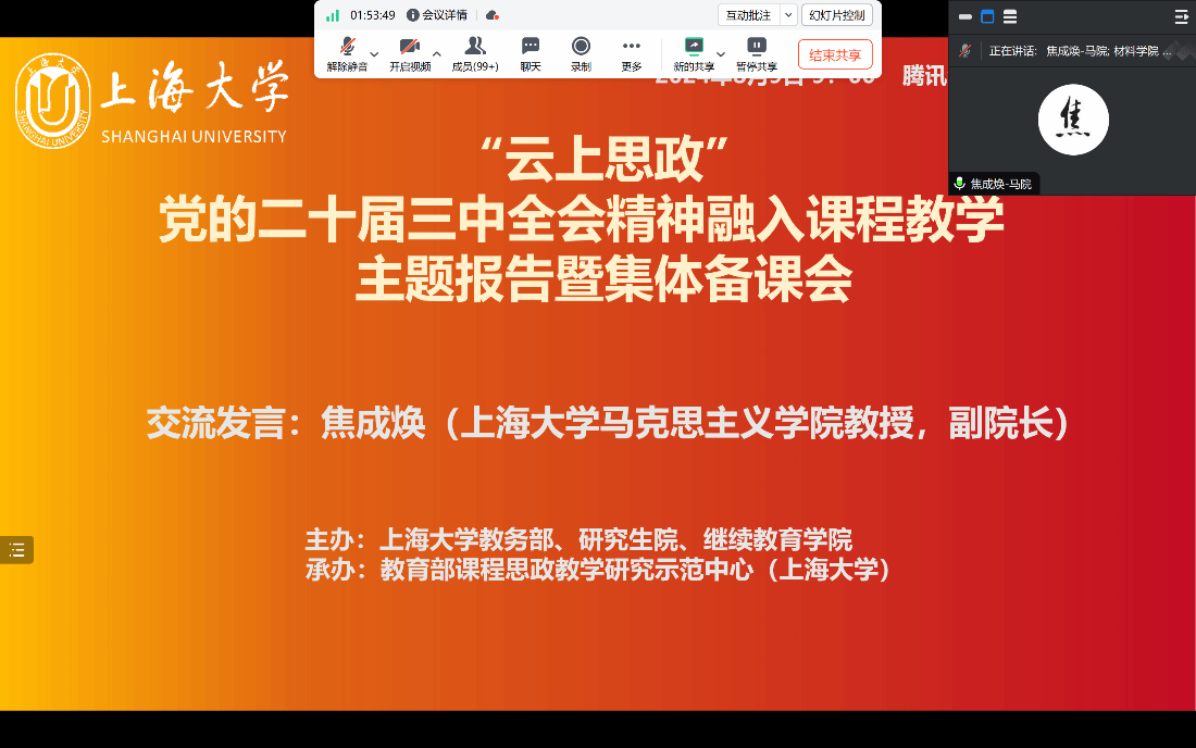 马克思主义学院副院长焦成焕教授分享了近期马克思主义学院依托市级“大思政课”实践教学基地建设,善用“大课堂”,善建“大平台”,善育“大师资”,推进党的二十届三中全会精神有效融入1+4+1+X思政课课程体系中的每门课程。