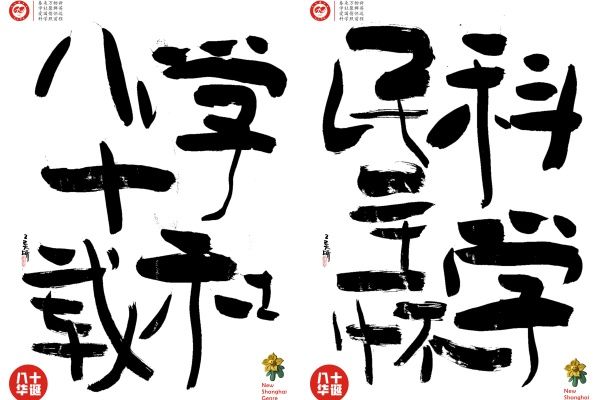 刘昕老师设计的《文字》系列,以“爱国、民主、科学”为主题的文字海报设计,以诗词“学社八十载、科学民主怀”来体现描绘九三学社创建80周年,弘扬“爱国、民主、科学”的主题思想。