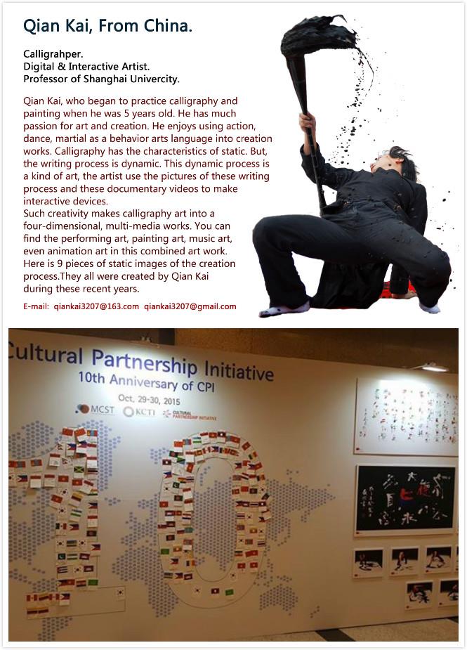 10月7日至11月1日,数码艺术学院教师钱楷受韩国文化部的邀请赴韩参加10th Anniversary of CPI国际文化学术交流会,并带去了名为《Culture&Clothes》的系列书法创意作品以及2014年CPI期间创作的书法交互装置作品的video静桢,这些作品被设置在展会的中心地带,受到韩国文化部以及与会数十个国家友人的高度关注和赞赏。钱楷老师书法功力深厚,在心怀传统的基础上不断探寻新的艺术表现形式与新的技术呈现手段,努力将书法的内化之美托出,追求“由表及里、由动及静”的方式展现书法之后的人文精神与华夏风骨,《Culture&Clothes》更是以其对传统书法的适度创意与突破赢得了外国友人的认同和喜欢,力求让身处数字信息时代的人们能够回归传统,看懂书法,能够深入的感受到来自精粹文化的魅力。