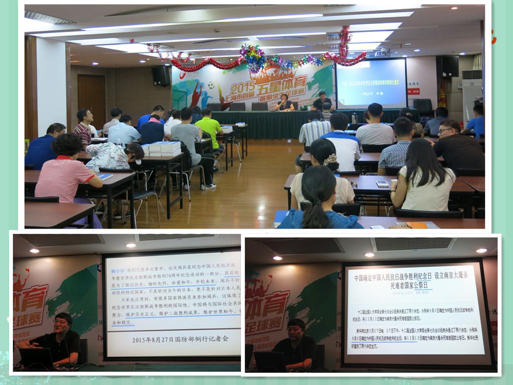 为纪念中国人民抗日战争暨世界反法西斯战争胜利70周年,9月11日下午,体育学院直属党总支在校本部体育馆新闻中心举行专题讲座,邀请了校社科学院副院长、全国高校优秀思想政治理论课教师李梁为专题讲座进行主讲。体育学院党政领导和全体党员参加了此次讲座。