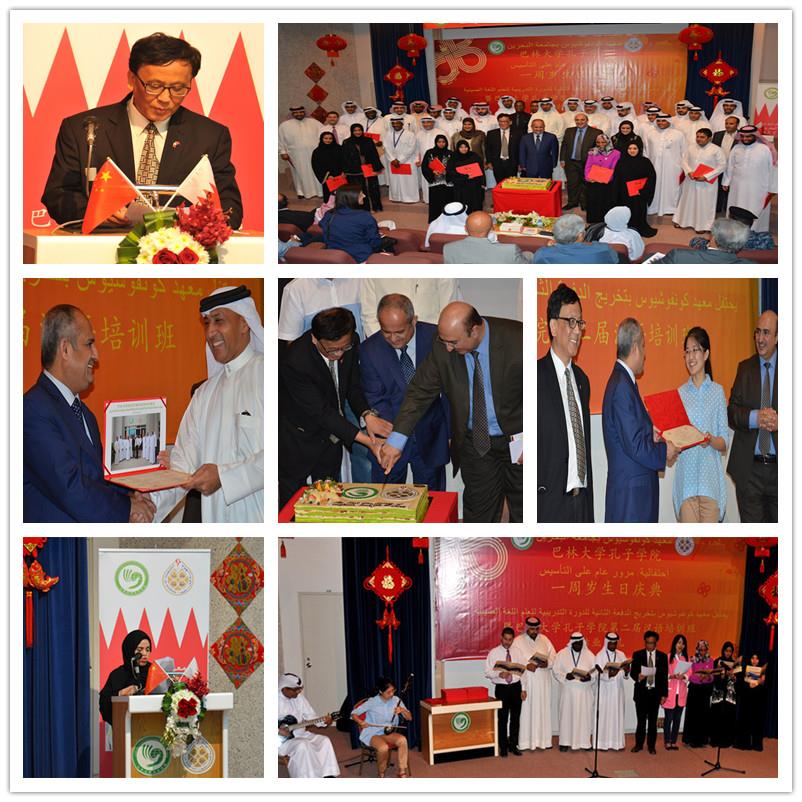 2015年6月15日,巴林大学孔子学院在巴林大学行政楼礼堂举办成立一周年生日庆典,同时为巴林王国第一个政府中级汉语培训班,第二期政府汉语初级班和巴林大学教职工汉语培训班学员举行结业典礼。参加此次盛典的有巴林大学校长Ebrahim博士,副校长兼巴林孔院外方院长Waheeb博士,巴林大学董事会成员,各院系院长,以及来自巴林王国各政府部门的政府官员,巴林大学教职员工等,与会人数约180人。