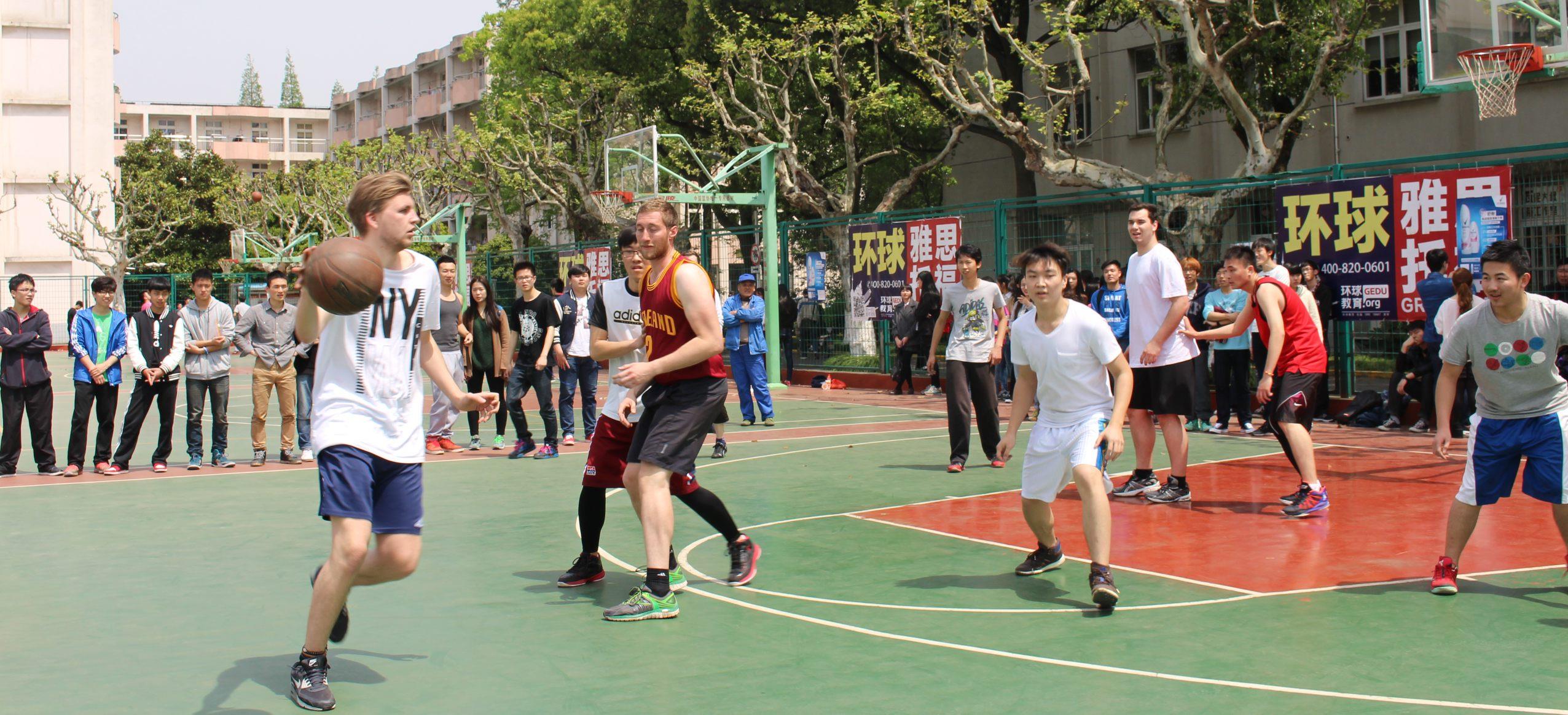 4月17日中午,嘉定校区篮球场人声鼎沸,悉尼工商学院由国际部主办、国际导生Club和体育部承办的中外学生篮球友谊赛开始了。悉商学生组成的中国队与来自德国,芬兰,荷兰的交流生组成的国际队进行了一场精彩的比赛。