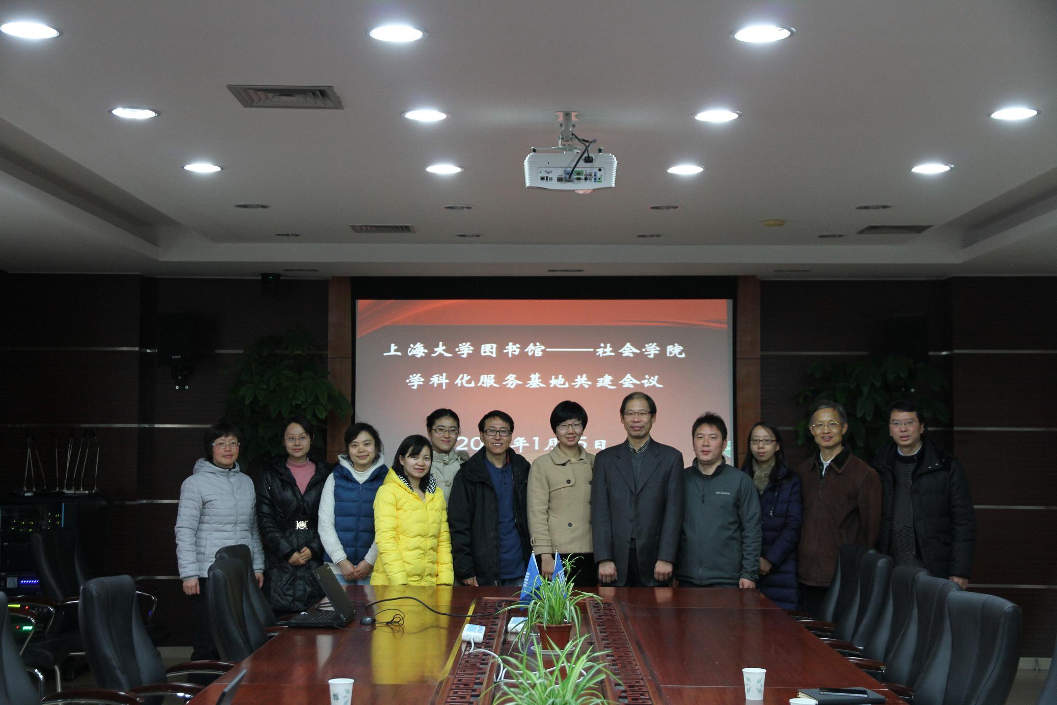 2015年1月15日上午,“图书馆-社会学院学科化服务基地”共建事宜商洽在校部B417进行。社会学院直属党总支书记沈艺主持会议,图书馆常务副馆长陆铭、社会学院副院长刘玉照、图书馆副馆长卢志国分别就图书馆的信息化建设、人文社会学科学术研究信息化支持等主题开展讨论交流、。双方一致认为学科化服务基地共建将促进社会学院的学科建设,图书馆的服务更具有针对性,这也是双方共建的基础,希望通过协议的签署,具体落实今后的工作。随后,刘玉照副院长和卢志国副馆长分别代表社会学院和图书馆在协议书上签字,出席会议的还有来自社会学院和图书馆的教师和馆员代表。