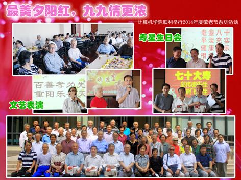 金秋送喜,丹桂飘香,在这个收获的季节里一年一度的重阳节又到了。为了弘扬中华民族“敬老爱老”的传统美德,切实关怀学院离退休的老同志,让他们度过一个快乐祥和的节日,计算机学院精心筹划了2014年度敬老月系列活动,让老同志们感受计算机学院这个大家庭的温暖和薪火相传的精神。