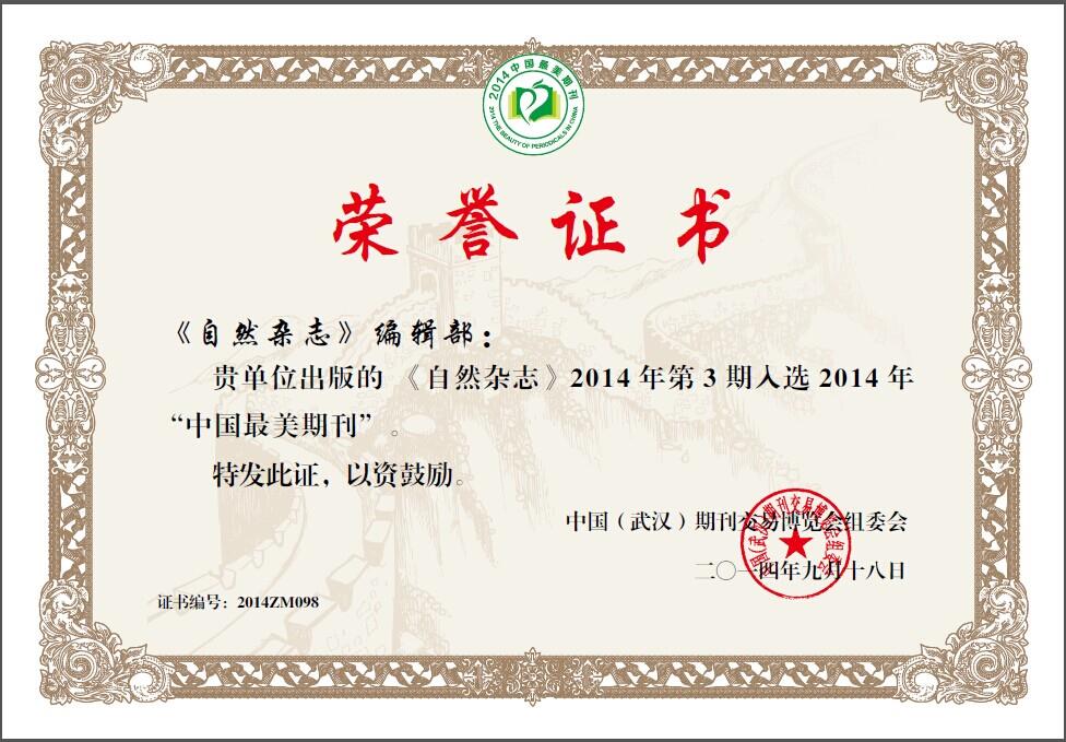 2013年以来,《自然杂志》全新改版,图文混排,全彩印刷。装帧力求规范严谨,和谐优美,实现科学性与艺术性的统一。一方面准确传达高级科普杂志的定位,另一方面以富有美感的方式呈现。整体设计通过字体、颜色和图形的反复使用,突出杂志的鲜明特色,提高读者的识别度和认可度,树立杂志的形象。封面采用全页全图设计,选用由专业摄影师拍摄或作者提供的精美图片,既揭示当期杂志内容的主题,又具有一定的美学价值。例如,参评“中国最美期刊”的2014年第3期杂志封面为《青藏高原航拍图》,不仅切合该期杂志刊登的“青藏高原”专题,而且大气磅礴、气象万千,令人叹为观止。