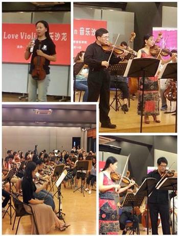 叶老师的讲话结束后,在夏小曹老师的带领下,音乐沙龙活动进入下一个环节:拉琴。在场的同学们纷纷拿起了自己的小提琴,甚至有个几岁大的小提琴琴童,也来开始体验小提琴演奏的乐趣。来自学校各院系的非音乐类专业提琴爱好者和老师们,与音乐学院的师生一起,组成规模庞大的弦乐团,总计48把小提琴,6把中提琴,7把大提琴,2把低音提琴。夏老师边辅导边演奏,指导大家拉小提琴,从如何拉小提琴音阶,如何运弓,一直到乐曲的处理方式她都毫无保留的告诉各位同学,同学们在她的带领下拉奏了《小步舞曲》、《神秘园之歌》和《卡农》这三首曲子。在弦乐团同学的帮助以及小提琴爱好者同学的努力演奏下,几首曲子从刚开始的生涩,变得逐渐成熟,一首比一首拉得好,夏老师甚至惊呼:“你们已经拉得很好了,根本不需要我来教!”