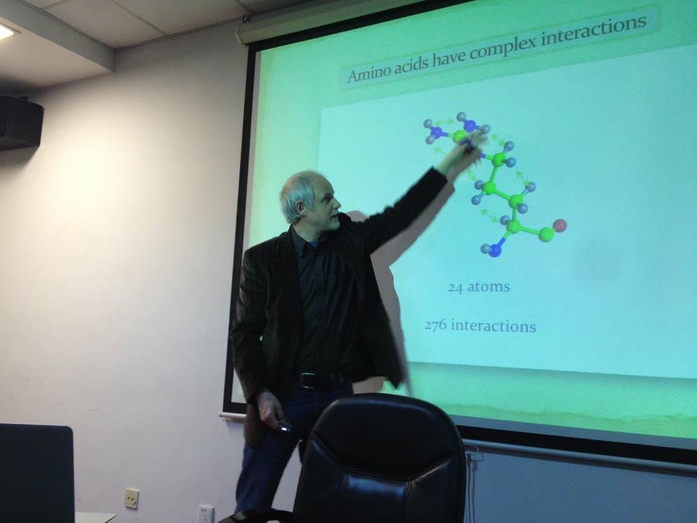 此次讲座Antti Niemi教授介绍了他们科研组在蛋白质折叠方面的最新工作。蛋白质(protein)是生命的物质基础,它的功能完全取决于它的三维构型,而其构型则源于折叠。一个错误的折叠就会使蛋白质完全丧失其功能,错误折叠的蛋白质甚至对有机体而言是危险的和致命的。如,目前公认很多退变性疾病、多种癌症就是由特定蛋白质的错误折叠引发的。这就使得我们有必要认真研究如何去描述蛋白质的三维形态。Antti Niemi教授以迪拉克名言——“生命的最大谜团也是理论物理的谜团”开场,继而提出以下问题:“蛋白质是如何折叠成具有生物活性的构型?它折叠的方式是什么样子的?蛋白质如何自组织的找到正确的折叠方式?”探讨一个复杂的物理体系,物理学家总是要简化问题,提出理想化的模型以描述这个物理体系。Antti Niemi教授从介绍有关20多种氨基酸结构、蛋白质的组成以及空间结构方面生物知识方面入手。以简单的生活经历——具有螺旋结构的电话线为例,为大家解释了蛋白质折叠的物理基础:twisting和bending作用。同时加入对称性的考虑,建立蛋白质折叠的孤子模型。计算机模拟结果显示该模型精妙地描述了蛋白质折叠的形态。