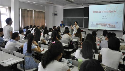 首先,院党委书记、院长陶倩表达了对2015级新生热烈的欢迎,并鼓励大家要学会充分利用时间去读书,积极参与学院的课题研究,认真执行学院的学业报告制度,为三年的研究生生活做好充分的准备。紧接着,陶倩用了问题解析式教学方式,为大家带来了“抗战纪念与90后的使命”的精彩讲座。陶倩用先提问,后解答的方式,启发大家积极思考,帮助大家了解了中国抗战的基本认识、中日关系的基本方针、我国外交的立体布局以及90后大学生的神圣使命等。这不仅回应了学生困惑的问题,而且增强同学们维护民族尊严、树立民族自信的意识。陶倩用习总书记的话作为结语:“国家的前途,民族的命运,人民的幸福,是当代中国青年必须和必将承担的责任。”陶倩充满激情、感染力的讲座使在座的每一位同学在精神上受到了极大鼓舞和洗礼。